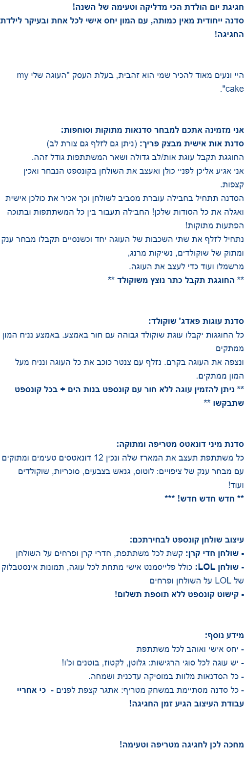 הזמנתי את זהבית אלינו להפעלת יום הולדת לבנות בגיל 10. התרשמתי מאוד מהמקצועיות ומהאכפתיות. והכי חשוב העוגות היו מאוד טעימות וכל הבנות מאוד נהנו