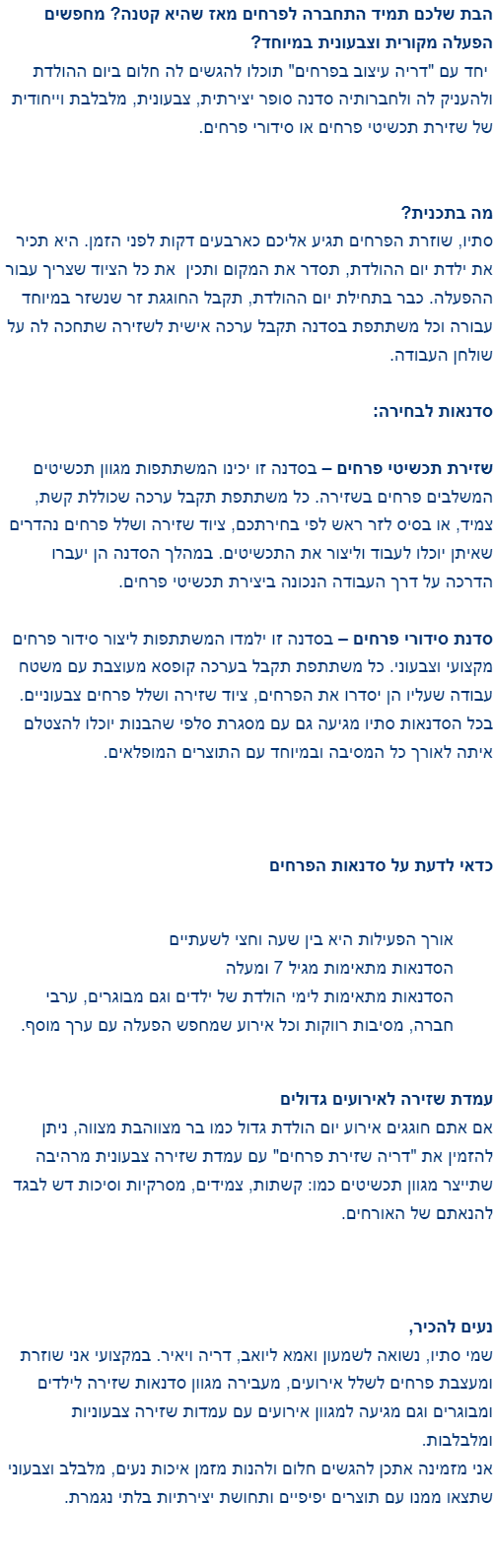 סתיו העבירה סדנת שזירת פרחים בבת מצווה שחגגנו לבת הבנות נהנו ויצאו עם זרים מהממים פעילות משמחת ומעשירה את הארוע ממליצה בחום