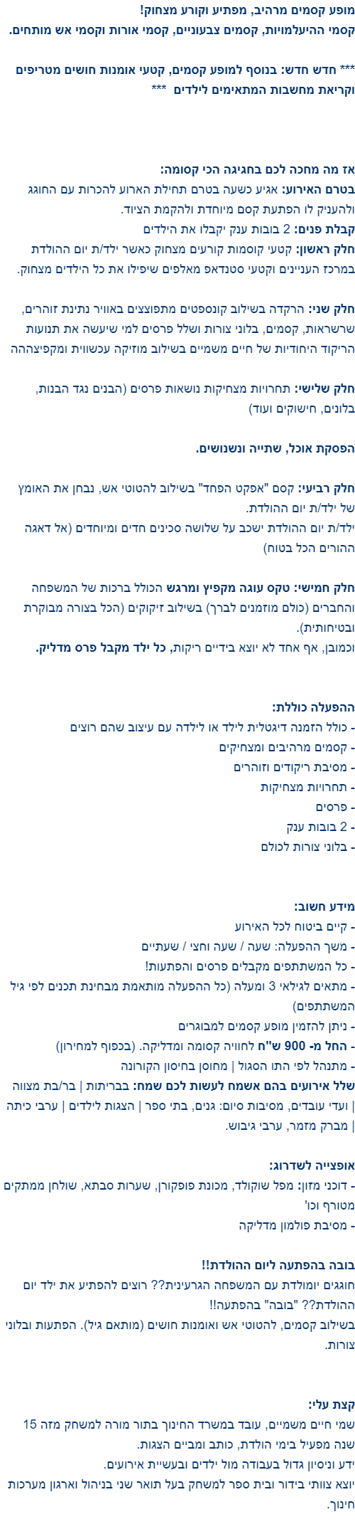 חיים משמיים אלוף הקוסמים תודה על מסיבה מושלמת בגן היובל בנשר מדהים איך כל פעם מחדש אתה משמח את הילדים שמרותקים לך מפעיל אותם בצורה הכי חוויתית שיכולה להיות ומשמח את הילדים וההורים כאחד תוך שאתה מאלתר במופע בקטעים מצחיקים וגורם לכל מי שמסביבך להנות . אתה הבחירה הכי טובה שיכולה להיות למסיבות ימי הולדת הפעלות ועוד... אין ספק שהקפצת את המסיבה בגני בכמה רמות!! ואני ממליצה לכולם! כל מופע שלך פגז! מודה לך ומעריכה הגננת הילה