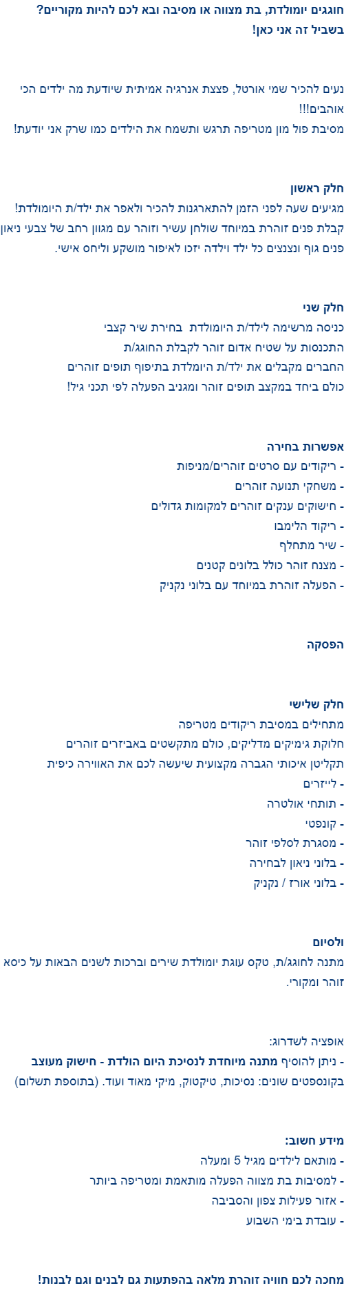 שנה חיפשתי לעשות יום הולדת מדליק ושונה לבת שלי יעל,קיבלתי המלצות מחברות על בחורה בשם אורטל שעושה את זה "אחרת" מהרגע הראשון שנפגשנו הבנתי שזו האחת,אורטל שמפעילה את חווית ריקוד מפעילה את כל החושים של ההורים וכמובן של הילדים כיף אמיתי שלא ישכח,עברו כבר מספר ימים ועדיין אנחנו, כל המשפחה נזכרים בחוויה המדהימה שעברנו עם אורטל והשקעה הבלתי מוסברת, הנתינה האין סופית החום והאהבה... ממליצה בחום פנינה .
