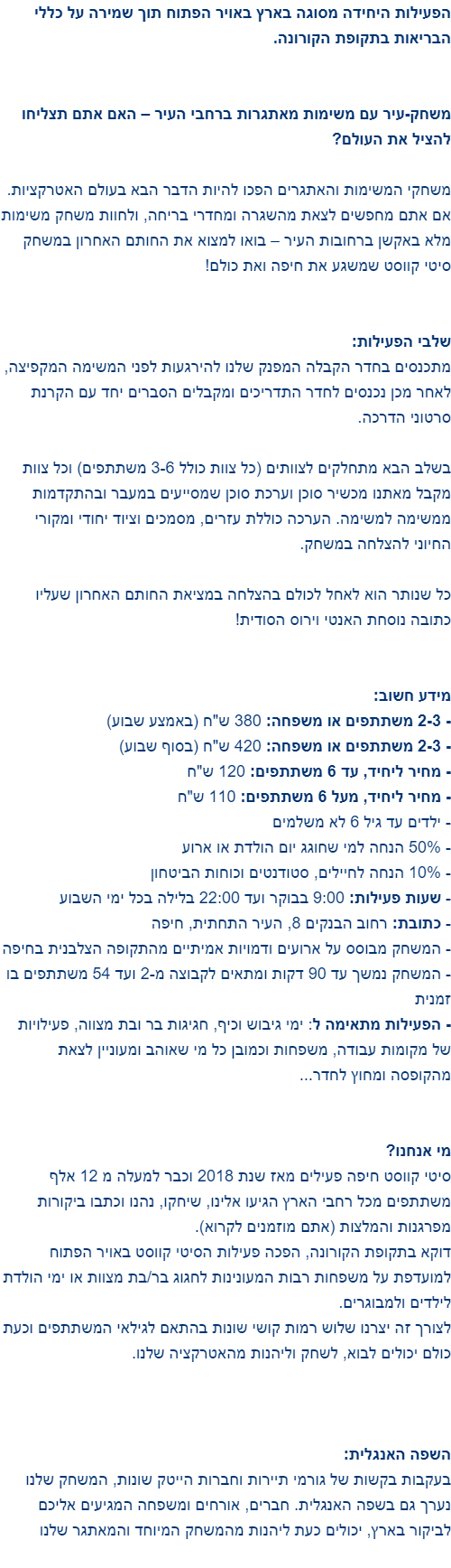 במילה אחת וואו! משחק כיפי מרתק ומגבש במיוחד לצוותי עובדים צוות המקום היה מקסים ולבבי