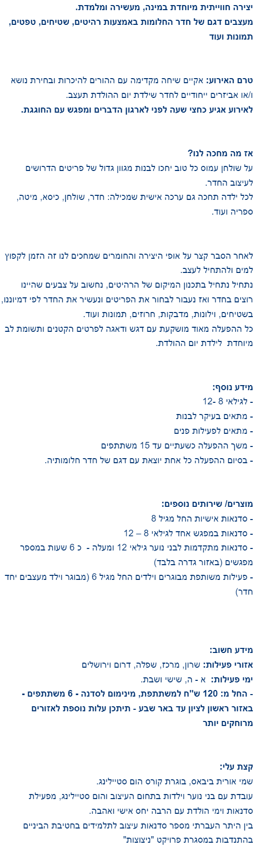 תודה רבה רבה! הייתה פעילות מדהימה ממש! הבנות ובן כל כך נהנו והתרגשו מהחדרים היפים שעיצבו. דניאל הייתה נרגשת במיוחד מהפעילות ומהחדר שעיצבה. ממש מרשים כמות הפריטים הקטנים והיפים שחשבת עליהם והדברים היפים שהכנת מראש לדניאל ובן. מעריכה מאד! תודה על הסבלנות וההשקעה. תודה על הכול!