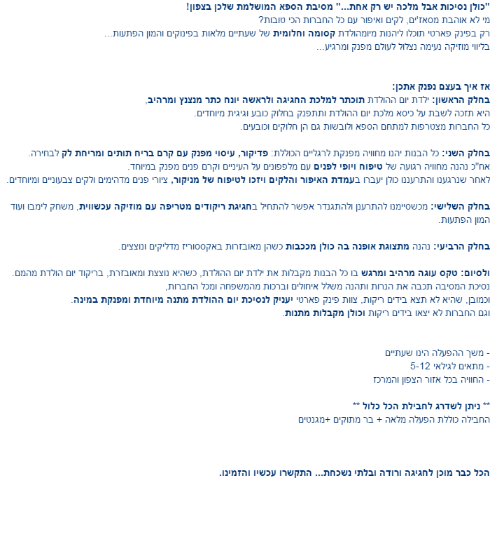 וואוו אני בכלל לא יודעת מאיפה להתחיל! קודם אני רוצה לברך אותך שתהיה לך פרנסה בשפע אושר ומלא טוב לא פשוט לעבוד עם ילדים..לא פשוט להיות סבלני ושוב כל הכבוד!!!! אני רוצה להודות לך שגרמת להללי ציפורה לחייך ! הילדה הייתה במרכז וכל מי שלקחה חלק ביום ההולדת קיבלה את הפוקוס שלה! את אלופה שתמיד תשמחי ילדים ?