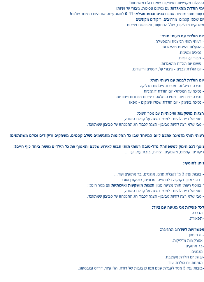 רעותי תותי את פצצה!! ואני ממליצה עלייך בחום!!! תודה על ההפקה המושקעת שעשית לבן שלי!! כל הילדים נהנו והשתתפו!!